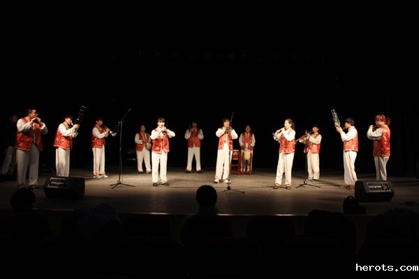 “休门吹歌”是河北省非物质文化遗产,已有300多年历史,但目前存在着群众了解少、传承人青黄不接的状况。作为河北省非物质文化遗产传承基地,我院深入挖掘地域特色文化,积极传承、弘扬和发展燕赵文化遗产,将“休门吹歌”这种民间艺术形式引入民族管乐合奏课课堂,并聘请有“吹破天”之称的“休门吹歌”传承人付锡芬老师亲自授课、排练,精心编排、传承创新这一独特的演奏形式,所排练的曲目《大家乐》、《放驴》曾在第四届“文华艺术院校奖——全国青少年民族乐器演奏比赛” 中摘得“文华奖鼓励奖”。