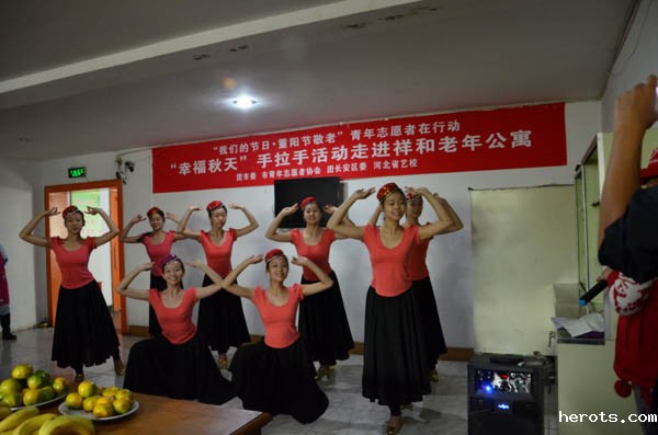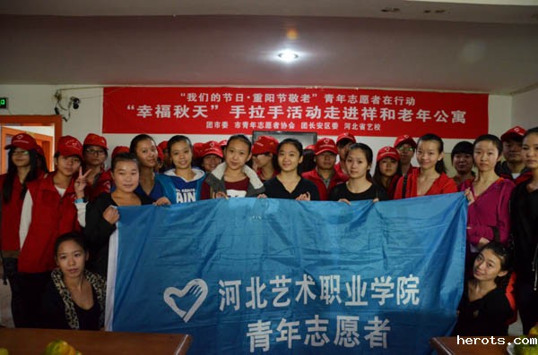 九九重阳节,浓浓敬老情,2013年的重阳节,我院团委青年志愿者一行30余人前往石家庄市祥和老年公寓举办了慰问活动并进行了了文艺演出。这次名为“幸福秋天”手拉手的慰问活动是我院与团市委、市青年志愿者协会、团长安区委共同组织的。