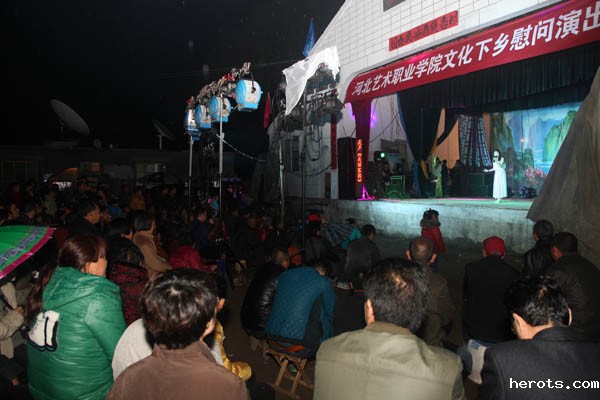这是今年学院第二次组织文化下乡慰问演出了。下乡演出是苦差事,此次演出队经过三个多小时山路,到了演出地点现时搭台布景。山区夜晚清冷,演员们穿着薄薄的演出服依然激情饱满。彭蕙蘅老师激动地说,“看到老乡们冒雨观看演出,我们很感动,他们对文化的渴望也让我们深感惭愧,希望有更多的机会为山区群众演唱。”此次文化下乡,既让广大农民群众感受到改革开放的时代韵律,营造出和谐、稳定、发展的氛围,同时又使学院师生真正深入到鲜活的基层生活中感受社会发展新变化,丰富自身舞台表演经验。