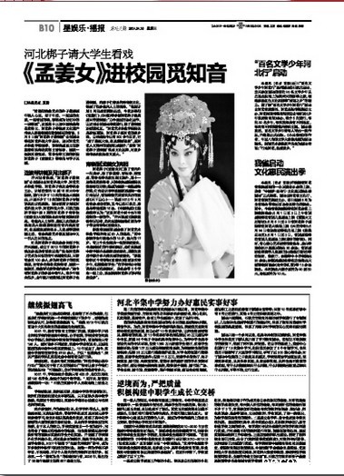 河北梆子《孟姜女》汇聚了省内外一批高手,除了彭蕙蘅、雷保春、陈宝成、常春生等名家担纲主演外,第十一届梅花奖获得者、天津歌舞剧院副院长张曼君任导演;编剧为国家一级编剧杨舒棠;灯光设计邢辛是国家话剧院一级灯光设计,曾助阵张艺谋首次执导的京剧《天下归心》……该剧2013年9月在省会成功首演,迄今已在石家庄、秦皇岛等地巡演16场。《中国戏剧》主编赓续华认为:“这是河北十到十五年来难得的一部佳作。”昨天该剧主演彭蕙蘅告诉记者,此次走进校园他们将为学子带去青春版《孟姜女》。