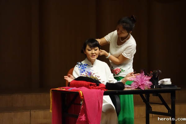 讲座尾声,彭老师还把戏曲艺术的点睛之笔——化妆与造型搬上舞台,让大家更真切、更直观地领略到戏曲旦行化妆的全过程。最后,彭老师为大家彩唱、表演了一折河北梆子最著名的代表剧目《宝莲灯》。
