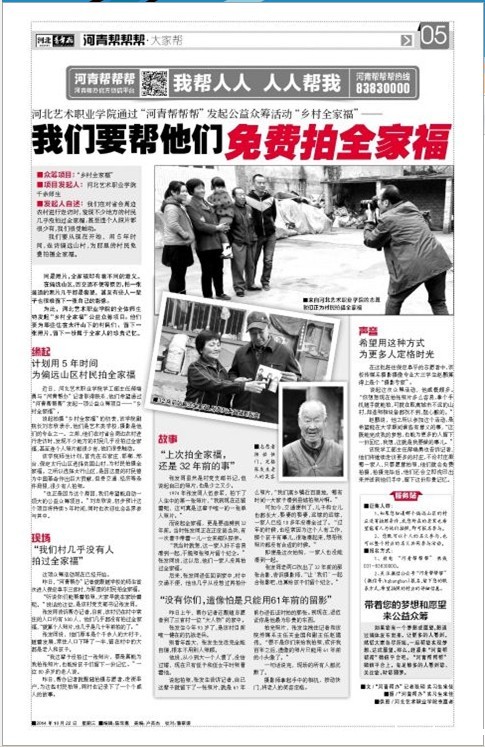 说起拍摄“乡村全家福”的初衷,该学院副院长刘志欣表示,他们是艺术类学校,摄影是他们的专业之一。之前,他们在对省会周边农村进行走访时,发现不少地方的村民几乎没拍过全家福,甚至连个人照片都很少有,他们很受触动。该学院师生计划,首先在石家庄、邯郸、邢台、保定太行山区选择贫困山村,为村民拍摄全家福。之所以选择太行山区,是因这里的村民曾为中国革命作出巨大贡献,但受交通、经济等条件局限,很少有人拍照。