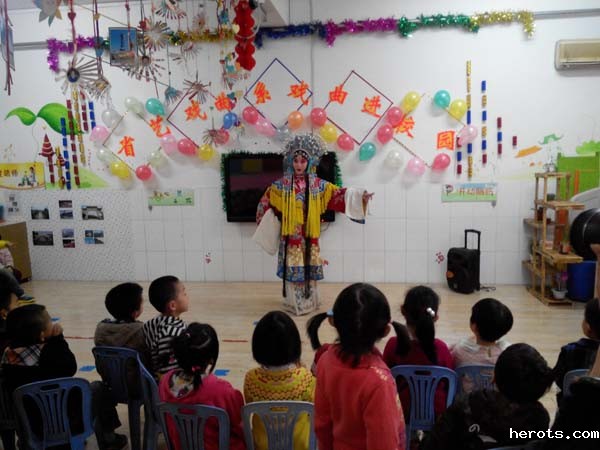 戏剧系老教师闫春华用通俗易懂、富有趣味的语言为幼儿园200余名师生讲解了河北梆子的服装、动作、唱腔等知识。戏剧系12梆子班双胞胎“姊妹花”戏曲小梅花获得者——康佳欢、康佳乐倾情演绎了《穆桂英挂帅》、《大登殿》、《孟姜女》等选段。声情并茂的演出获得了全体师生高度的评价和热烈的掌声。