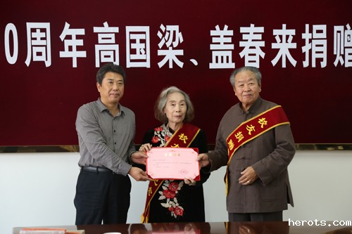 高国梁、盖春来老师把多年来珍藏的建校之初的珍贵老照片17张以及《生命之美盖春来》画册5本赠送学校。庞院长代表学院接受捐赠并为两位老人颁发了捐赠荣誉证书。