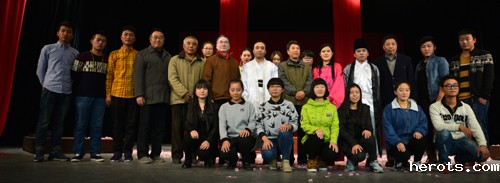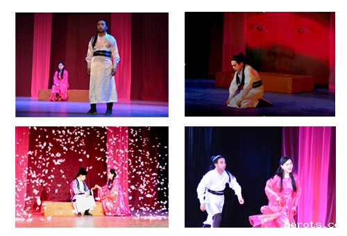 舞台剧《夜中叹》根据邹静之先生的话剧剧本改编,是学院美术系舞台美术专业2015年专业实践课的教学项目。该剧从台下的灯光、服装、化妆、音效、道具、制景等舞美相关的内容到台上的演员表演全部由舞美专业师生完成。其中,高峰老师在完成舞台和多媒体设计的同时,还担任主演,其它主要演员由学生马海娜、程书龙担任。舞台剧《夜中叹》在原剧本基础上进行了少许修改,并在舞台美术方面进行全新的创作,运用多媒体表现了人物杀人后内心懊悔恐惧的感觉。在舞蹈表现上,演员在表演中“跳出”自己的角色,以旁观者的角度去审视所饰演的角色,引导观众对剧中角色命运的思辩,分别从三个角色的角度去思考剧情,并在剧中展现了多种可能性,类似于黑泽明《罗生门》的叙事手法。在演出中,笑声掌声不断,结尾时3000朵桃花洒落到舞台上,观众惊异的发出赞叹声。