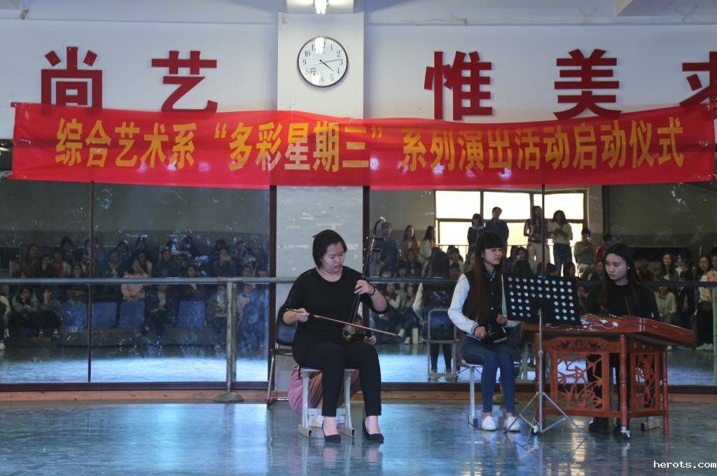 “多彩星期三”系列演出由综艺系音乐教育专业的同学策划、编排并演出。同学们充分发挥专业特长,表演了二胡独奏、古筝独奏、独唱、小提琴独奏及竹笛独奏等节目,演出现场气氛热烈。