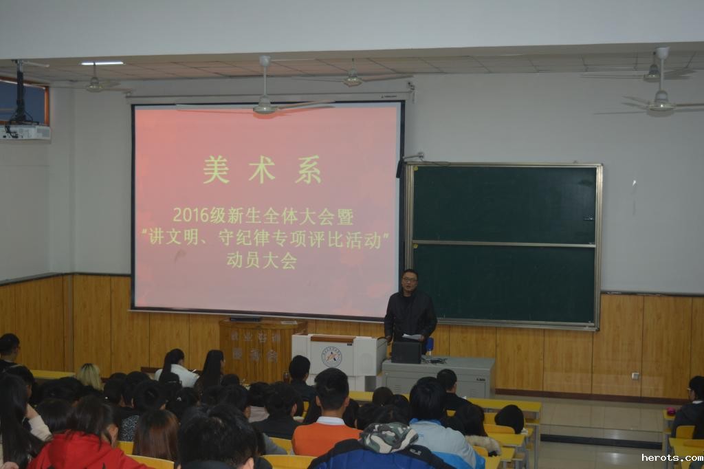 11月3日,美术系2016级新生全体大会暨“讲文明、守纪律专项评比活动”动员大会在阶梯教室举行。美术系主任郭志红、系相关负责人、辅导员以及2016级全体新生参加了大会。
