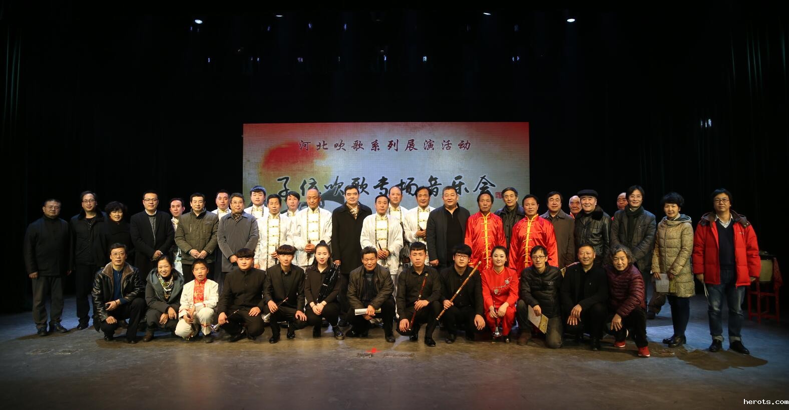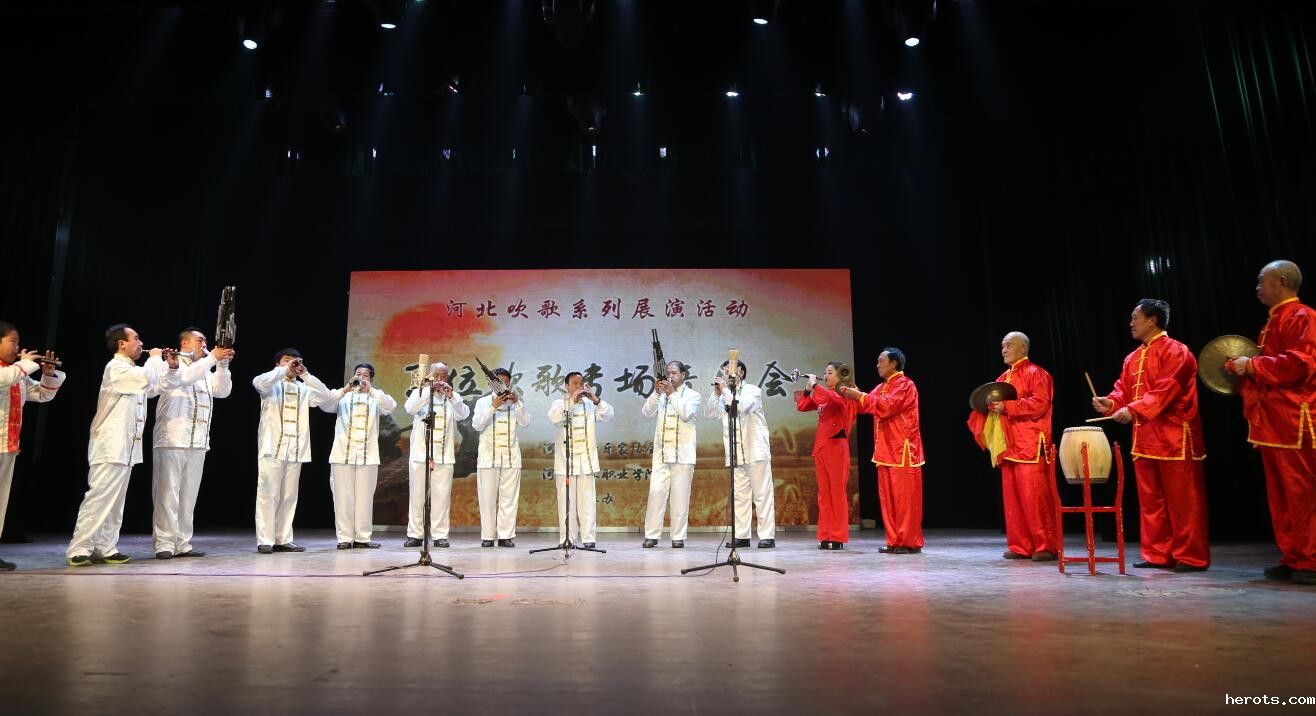 12月26日,学院四楼剧场内曲声悠扬、掌声阵阵,由我院与河北省音乐家协会共同举办的子位吹歌专场音乐会正在这里举行。河北省文化厅、河北省非遗办、河北省群艺馆、河北省歌舞剧院,以及河北省音乐家协会、河北师范大学、河北民族管弦乐学会专家、学者来到现场聆听了这场音乐盛宴。我院党委书记赵宗更、院长庞彦强、党委副书记延凤宇、副院长刘飞、纪委书记张学红、副院长刘志欣出席演出,音乐系外聘教师休门吹歌传承人付锡芬,音乐系、舞蹈系、戏剧系师生300余人观看演出。