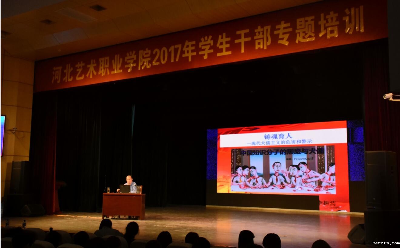 为提升学生干部能力、素质和工作水平,丰富学生干部视野,2017年4月12日,我院特邀请石家庄铁路职业技术学院教授、学生处处长李振涛,在我院四楼剧场进行题为《铸魂育人——现代犬儒主义危害与警示》的报告。各系辅导员以及学团干部、学生会社团等学生组织优秀成员三百逾人参加了培训。