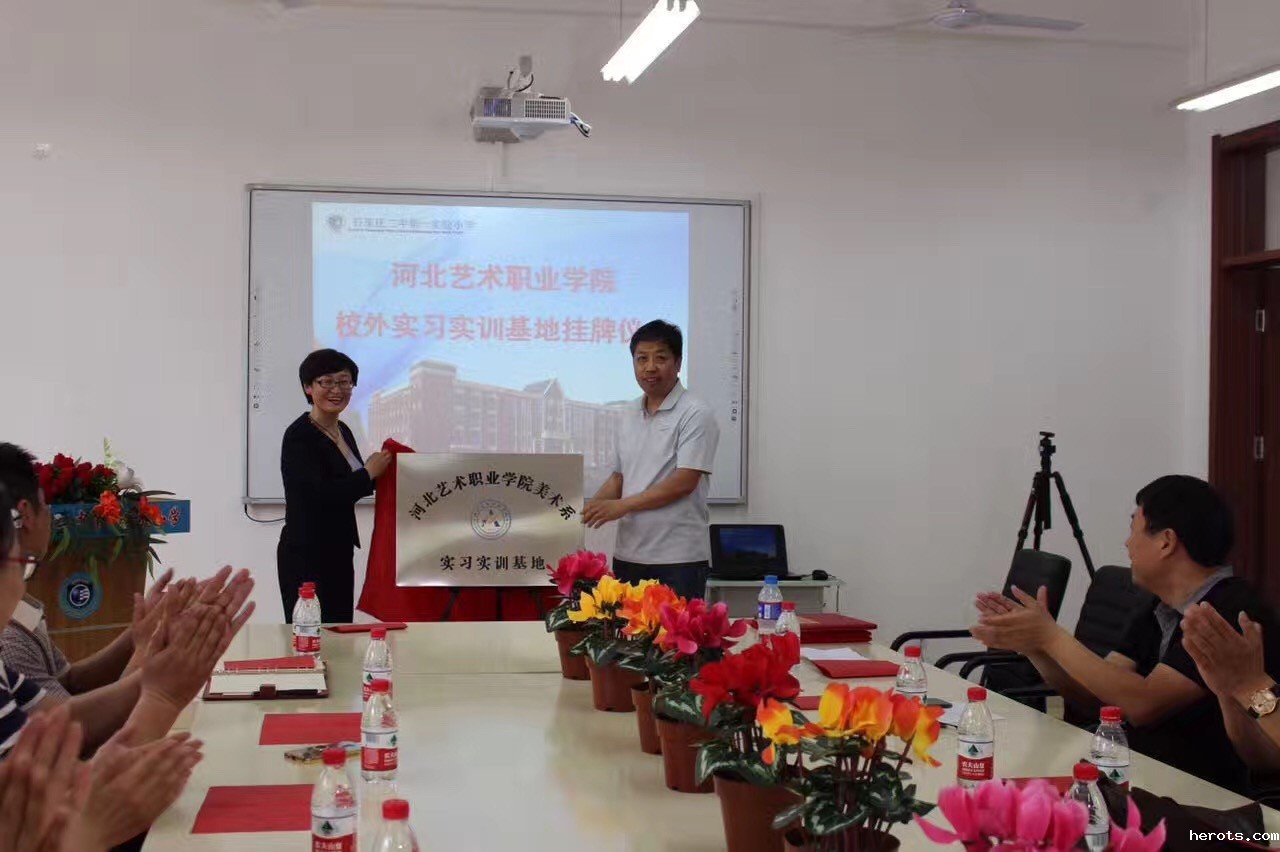 2017年5月11日,我院美术系与石家庄二中第一实验小学举行实习实训基地揭牌仪式,开启我院美术教育专业与小学教育合作的模式。美术系主任郭志红、社会教育部主任宋平、实践中心主任白文刚、美术系副主任王旸、栾城区教育局副局长李瑞平、石家庄二中第一实验小学校长赵郡、副校长李晓静等领导代表以及美术教育专业师生共同参加了揭牌仪式。
