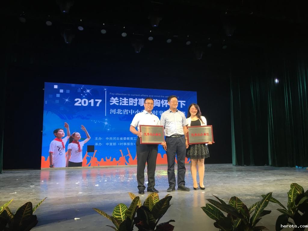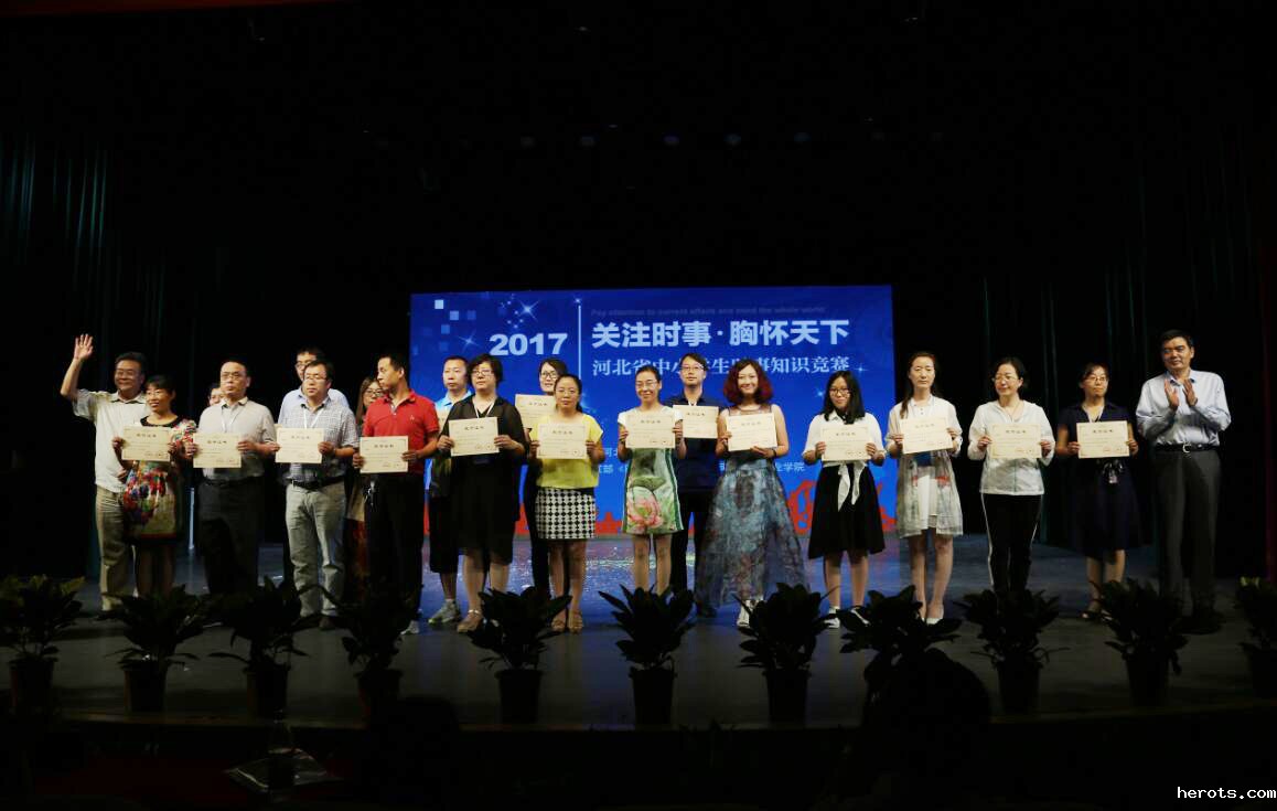 比赛结束后,中宣部《时事报告》杂志社总编张旭、大赛组委会主任、省教育厅副厅长王廷山、院党委书记赵宗更、院长庞彦强、党委副书记延凤宇等领导为获奖同学颁奖,并对获奖选手良好的综合素质予以肯定。王廷山副厅长高度赞扬我院连续两年圆满完成比赛承办任务,亲自向我院学生工作处(部)长郝端勇、中宣部《时事报告》杂志社河北站站长薛婷颁发“优秀承办单位”奖。