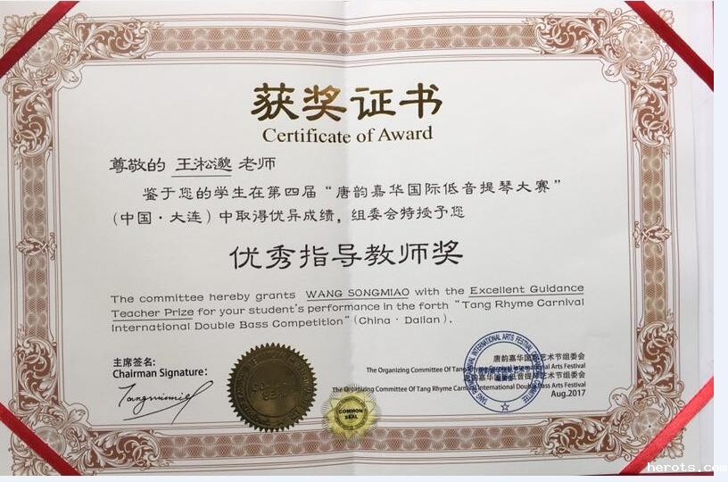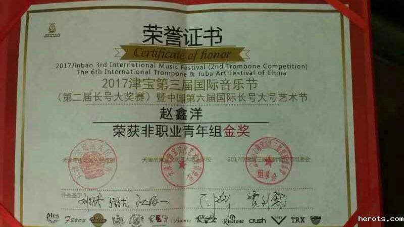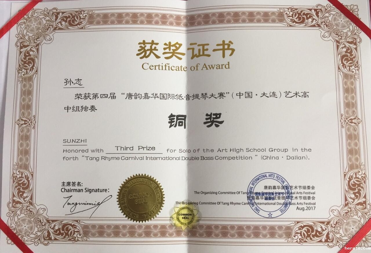 此外,在第四届“唐韵嘉华国际低音提琴大赛”中,我院音乐系13器小学生孙志荣获艺术高中组低音提琴独奏铜奖,我系青年教师王淞邈荣获优秀指导教师奖;在2017津宝第三届国际音乐节(第二届长号大奖赛)暨中国第六届国际长号大号艺术节中,12器小学生赵鑫洋荣获非职业青年组金奖。