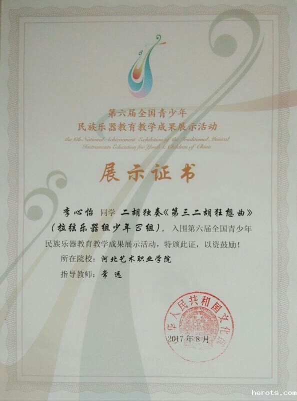 8月23日,我院师生入围第六届全国青少年民族乐器教育教学成果展示活动。在音乐系青年教师常远的指导下,学生李心怡参加拉弦乐器组少年B组比赛,演奏了二胡独奏的《第三二胡狂想曲》。