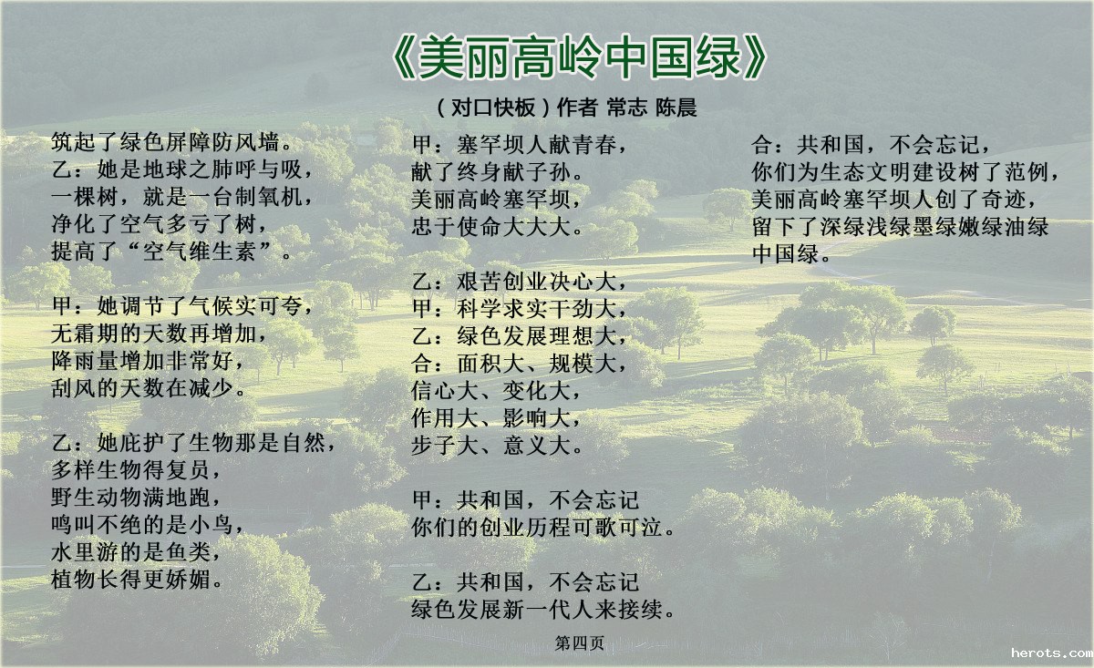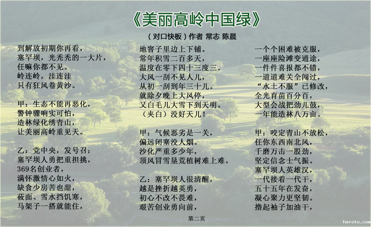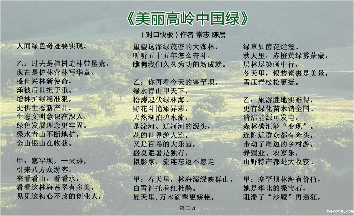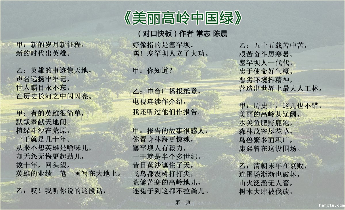 为弘扬和宣传塞罕坝精神,河北省著名快板表演艺术家常志先生携我院青年教师陈晨创作了对口快板《美丽高岭中国绿》,歌颂塞罕坝精神和绿色发展理念,喜迎党的十九大胜利召开。