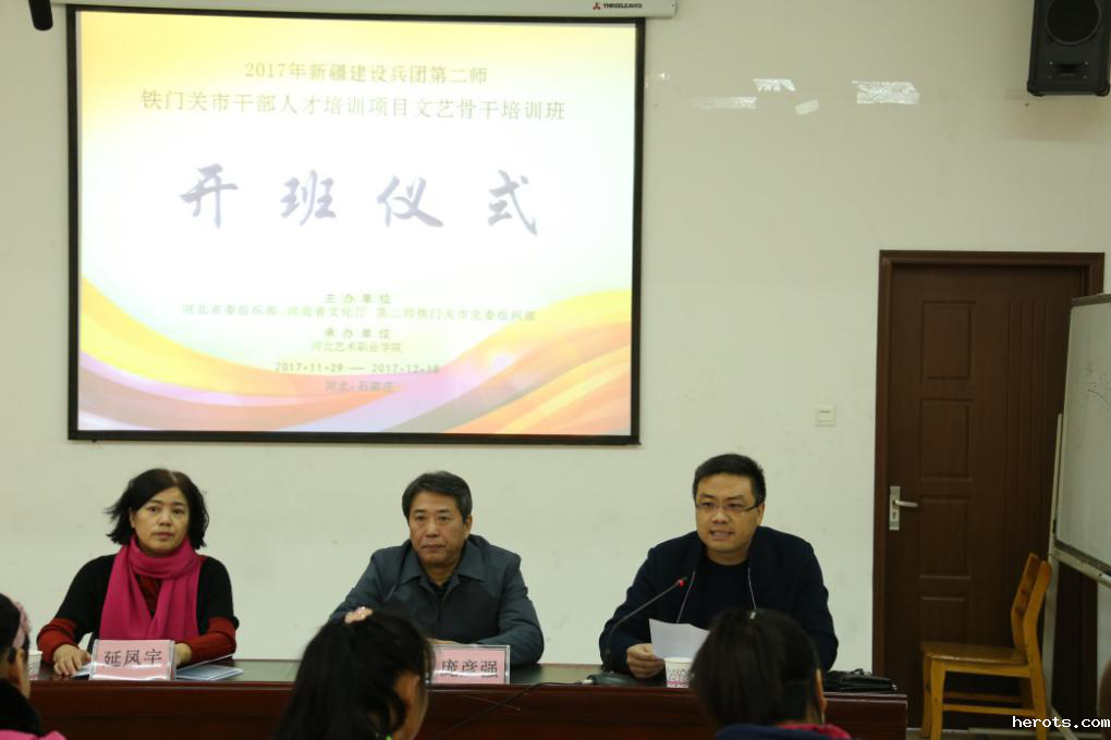 11月30日上午,由河北省委组织部、河北省文化厅主办,学院承办的“2017年新疆兵团第二师铁门关市文艺骨干培训班”在综合楼十一楼会议室举行开班仪式。学院院长庞彦强、党委副书记延凤宇,省文化厅人事处副处长商明凯以及党政办、社教部等部门相关人员出席开班仪式,延书记主持开班仪式。来自新疆兵团二师铁门关市各基层单位的文化骨干33名学员开启了为期20天的培训生活。
