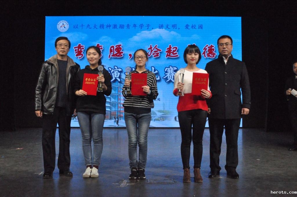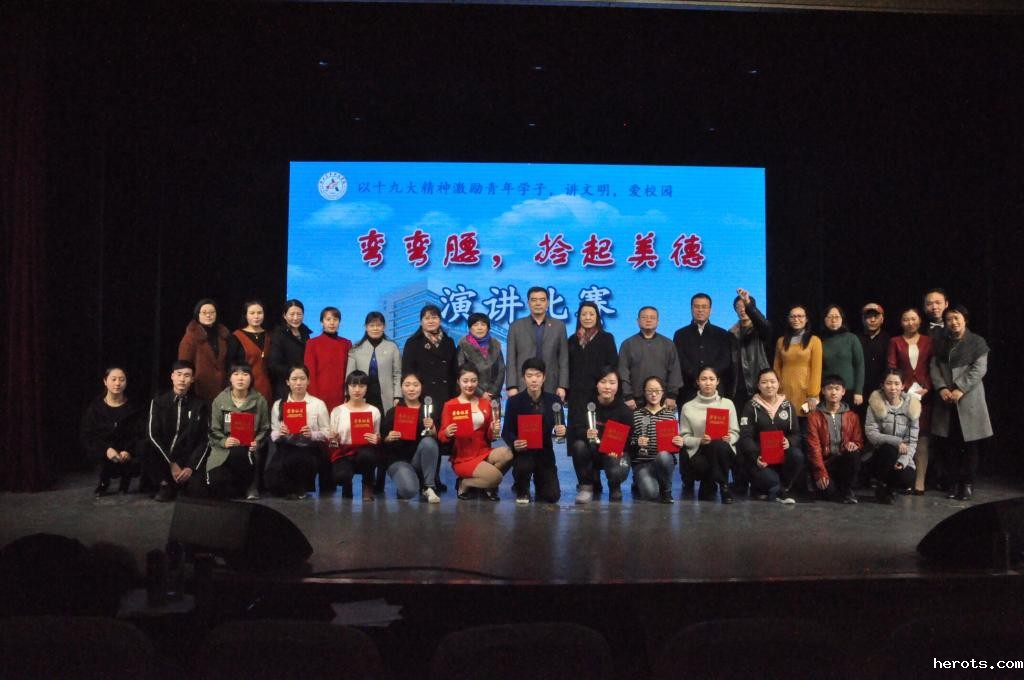 习近平总书记在十九大报告中指出:“文化是一个国家、一个民族的灵魂。文化兴国运兴,文化强民族强。没有高度的文化自信,没有文化的繁荣兴盛,就没有中华民族伟大复兴。”青年兴则国兴,青年强则国强。为认真贯彻党的十九大精神,加强青年学生的思想道德建设,提高其思想觉悟、道德水准、文明素养。用党的十九大精神教育激励广大青年学子,讲文明,爱校园。进而推进我院大学文化建设,立德树人,创建绿色校园,书香校园。12月11日下午在四楼剧场举行了“弯弯腰,捡起美德”——暨“捡起身边每一片纸,捡起每一根烟头”的演讲比赛活动。活动由基础教学部发起并主办,教务处和学生处协办。学院党委书记赵宗更、副书记延凤宇、副院长刘飞以及教务处、学生处等系部师生近300名师生共同观看了比赛。