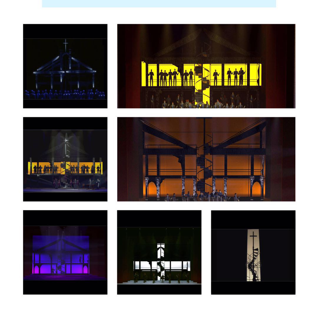 为了与舞美设计相统一,在灯光设计上我并没有使用过多的色彩,侧重运用灯位变化去塑造舞台的画面感,划分光区,表现人物与景物的空间关系。
