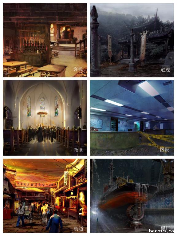 作品是以八幅影视场景气氛图来表现的,每一个场景都互相不关联,但是涵盖面比较宽泛。气氛图分别为:船厂、街道、医院、教堂、道观、酒楼和客栈,每个年代每个时期的表现手法也有所不同。