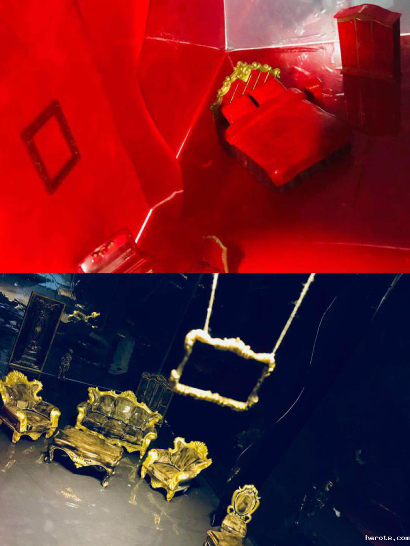 主要以红色和灰色为主的色彩设计,红色代表爱情象征与情人之间关系,灰色代表与丈夫之间的关系,一暖一冷这两种颜色颜色搭配起来可以有良好的视觉效果。背景采用正面反光纸来做,是为了增强家具烘托气氛,更加有多层次的错落感,增强环境本身所带来的双重叠现的效果。斜面的空间设计为了更加突出人物的双重性格,表现现实与幻觉的同在,是幻觉世界的人物又是现实世界中的人物。环境剧场的表演形式,将让观众更能感受品特戏剧的独特魅力。