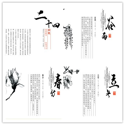 作品是根据二十四节气中,每一个节气都有相对应的花朵代表,通过手绘插画的手法表现出来。通过选用细腻的针管笔和具有历史感黄色的牛皮纸这两种材料结合而来,加上印章使画面具有唯美感、历史感、文化感十足。最后通过电脑处理后的插画图片加上每个节气应注意的饮食、作息、气候合成制作成一本手册。
