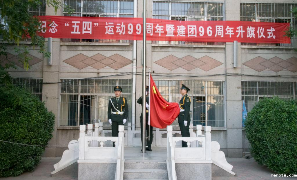 迎着清晨的朝阳,国旗护卫队队员们护送五星红旗,在全体青年学生的注视下,伴着庄严的国歌,鲜艳的五星红旗冉冉升起,迎着旭日,随风飘扬。