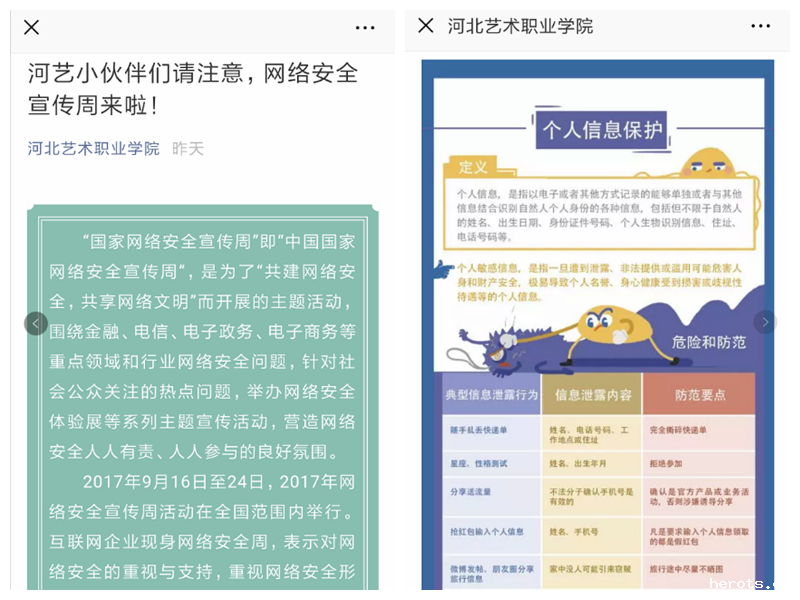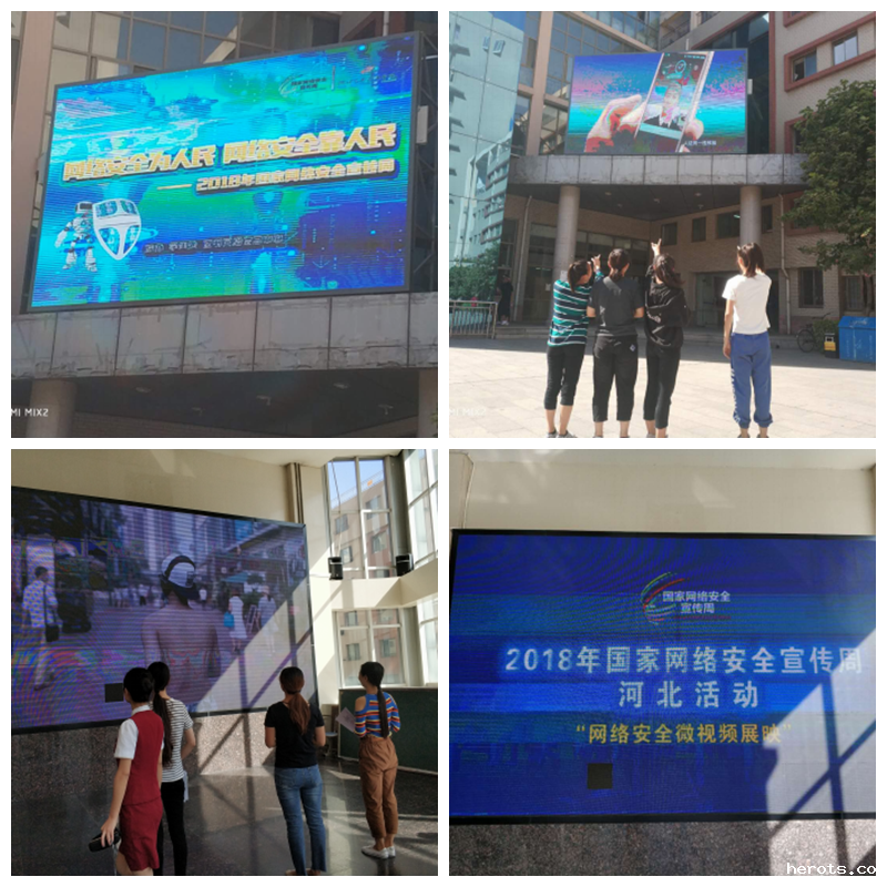 为了将宣传工作落到实处,学院通过多种宣传教育形式,增强全院师生网络安全意识,提高使用网络安全的技能。一是使用学院综合楼一楼大屏幕和戏曲排练楼门口大屏幕在大课间和早晚间滚动播放网络安全知识视频,以生动有趣的案例形式直观地向师生展示网络安全教育知识,共建和谐、安全、绿色网络环境。二是通过校园多媒体展示机展示网络安全教育常识手册,通过校园广播电台让全院学生在课余时间对网络安全教育相关知识有深入的了解。三是制作网络安全宣传专题网站,内容涵盖政策法规,案例分析,微视频,专家观点,风采展示等内容。四是利用学院微信公众号、教师资源共享群向师生推送网络安全教育方面知识、法规、图片、案例等内容。五是围绕“网络安全为人民,网络安全靠人民”的宣传主题,面向全院师生开展网络安全创新作品有奖征集活动。六是开展主题班会,各系以“青少年网络文明公约”为主题展开讨论,师生通过分析案例,总结经验,提高学生网络安全防范意识和辨别真伪能力。