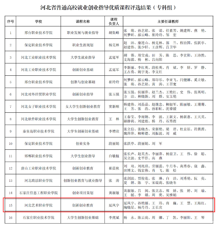本次优质课程评选活动由省教育厅于2018年3月启动,旨在进一步加强大学生职业发展、就业指导与创业教育课程体系建设,提升大学生就业创业能力。经过学校申报和专家评审,最终本专科院校共有36门优秀课程获此殊荣,其中专科组16门。