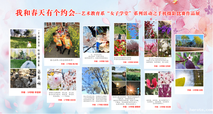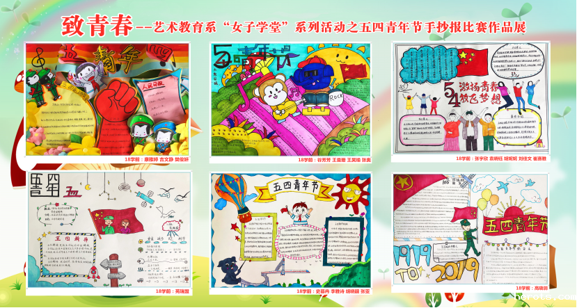 近日,我院艺术教育系“女子学堂”学生思政系列活动陆续开展,其中“我和春天有个约会”手机摄影比赛及“致青春”五四青年节手抄报比赛尤为精彩,同学们提交的作品不仅质量高,而且展现出当代大学生热情、积极、友善的良好风貌。