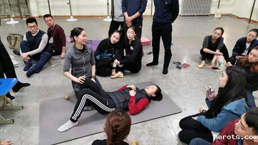 张梦珍老师通过讲解婴儿动作发展的构建过程,分析了人类动作发展肌动学与舞蹈训练的关联性,强调功能性关节中轴化、核心部分稳定性的重要作用,指出核心的稳定可以优化动作效率,产生力量、避免损伤。在肌筋膜放松课程中,张老师介绍了人体肌肉和结缔组织的解剖与构成,分析了长度与张力的关系,解读了自我筋膜放松的作用机理,讲授了如何借助道具进行自我筋膜放松提升柔韧性及修复、预防身体损伤。