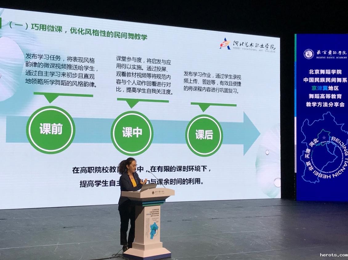 21日上午,杨绯老师应邀参加北京舞蹈学院中国民族民间舞系举办的京津冀地区舞蹈高等教育教学方法分享会,代表我院以“信息化背景下高职院校民间舞教学课堂创新研究”为题进行发言,就巧用网络微课、优化风格教学等内容作了重点阐述,与来自北京舞蹈学院、中央民族大学、天津音乐学院、河北大学艺术学院、河北经贸大学等院校的教师代表交流了课堂教学实践的方法经验。