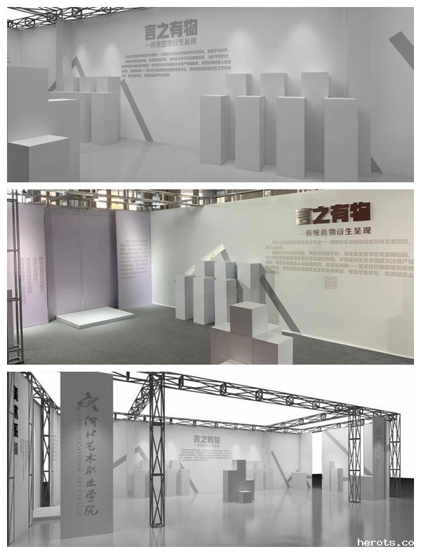 为更好地突出展品色彩的丰富与图案的精美,展台颜色选择以白色为主色调,配合清爽的银色装饰,整个展示空间显得简洁、典雅;展位创意与设计图制作由美术系环境艺术设计、视觉传播设计与制作、舞台艺术设计与制作师生共同完成。