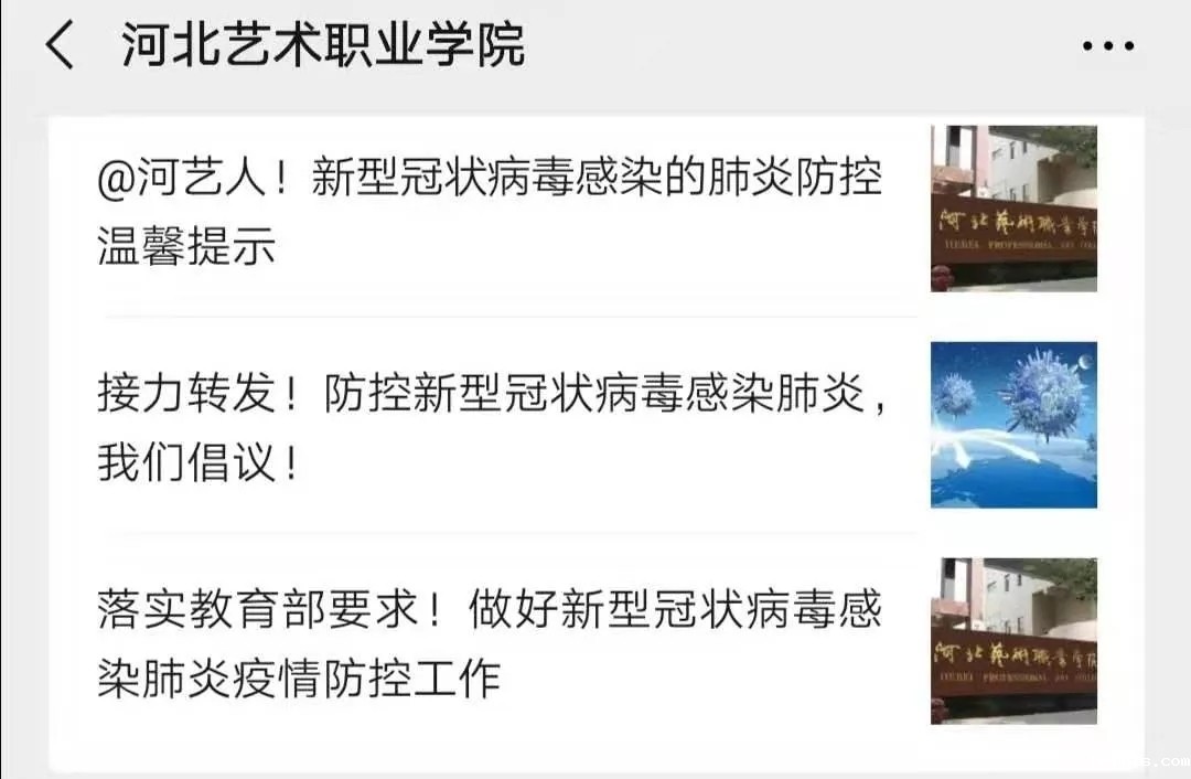 按照省教育厅、文旅厅等上级单位要求,对全体师生,全面摸排、分类统计、及时上报。通过学院公众号、师生微信群、QQ群等方式,开展网络教育。以转发河北省教育厅《致全体学生和家长的一封信》以及《@18luck新利官网登陆人!新型冠状病毒感染的肺炎防控温馨提示》、《接力转发!防控新型冠状病毒感染肺炎,我们倡议!》等师生易读易懂、喜闻乐见的方式将防控知识、防控要求等传达至每一位师生。督促师生提高防范意识,师生配合,落实学院疫情防控制度。