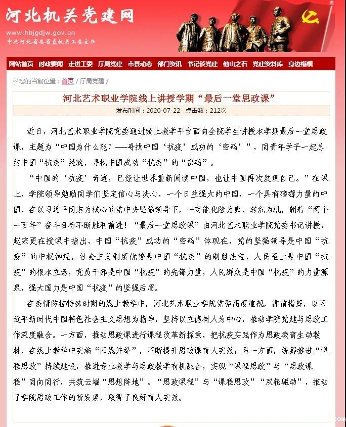 学院党委线上讲授“最后一堂思政课”的信息在7月22日得到了河北机关党建网“厅局党建”模块的宣传报道。河北机关党建网由中共河北省委省直机关工作委员会主办,全面报道我省机关党建工作的先进经验和典型案例。此次报道标志着省直工委对我院在疫情防控阶段思想政治工作的高度肯定。目前,该信息浏览量已达数百次。作为一所有着65年发展历史和光荣办学传统的国办全日制综合性高等艺术院校,我院在为河北文化旅游事业培养人才、服务社会的同时,尤其注重立德树人,鼓励师生在艺术实践中积极开展思政教育工作,全力推进习近平新时代中国特色社会主义思想“三进”工作。在学院党委的正确领导和大力支持下,“艺术+思政”有机融合的创新模式已逐渐成为18luck新利官网登陆的一大特色。去年7月30日,学院歌颂建党98周年的舞台情景演出《风帆》得到了《中国文化报》以“艺术院校思政课程的全新‘打开方式’”的专题刊载。随着新冠肺炎疫情的全球蔓延,2020年对于全国、全省教育都是极不平凡的一年,学院党委在充分这一严峻形势的同时,进一步提高政治站位,不等不靠,以决战决胜的信心、稳扎稳打的举措,牢牢把教育教学工作抓在手上,组织发动全院师生众志成城,把疫情影响耽误的宝贵时间夺回来,通过网络授课的形式真正达到了停课不停教、停课不停学。在严格防范疫情的同时,学院党委丝毫没有放松师生的思想政治教育工作,而是在既有经验基础上再接再厉,“思政课程”与“课程思政”双轮驱动,“五千师生同上开学网络思政课”、“线上课程思政,共筑育人华章”“把抗疫实践作为思政教育生动教材”等多个典型案例陆续得到了河北新闻网、文化和旅游部科教综合服务平台、《河北日报》等省内外主流媒体的报道,关于思政工作的外媒宣传数量创学院历年新高。