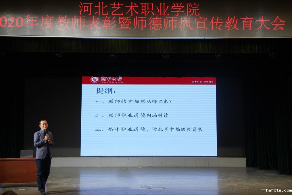 大会邀请到河北大学教育学院副院长王硕旺作题为《教师的职业道德和职业幸福》专题讲座。王老师以轻松幽默的方式,讲述了教师的幸福感从哪里来、教师职业道德的内涵,如何恪守职业道德、做配享幸福的教育家,以及教师的学生观、教师观和职业观。参会教师表示收获良多,对于如何看待学生、做学生成长的引路人,如何对待职业倦怠、不断在实践反思中成长等等,提供了有益的思考与借鉴。伴随着师德师风讲座的结束,本次教师表彰暨师德师风宣传教育大会圆满闭幕。