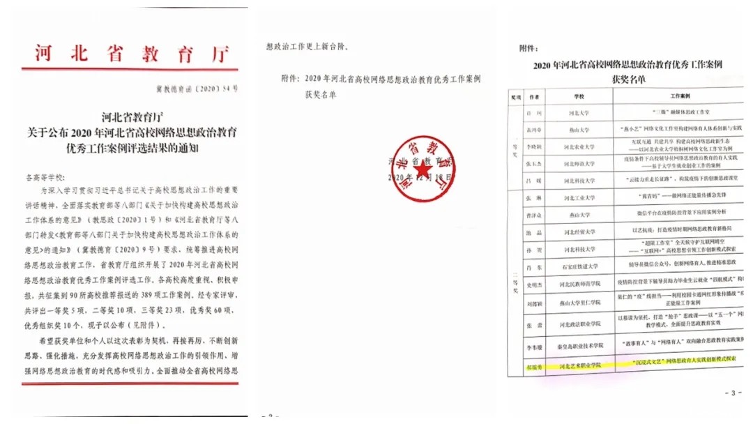 在近日《河北省教育厅关于公布的2020年河北省高校网络思想政治教育优秀工作案例评选结果的通知》中获悉,我院学工部长郝端勇撰写的案例《“沉浸式文艺”网络思政育人实践创新模式探索》喜获二等奖。