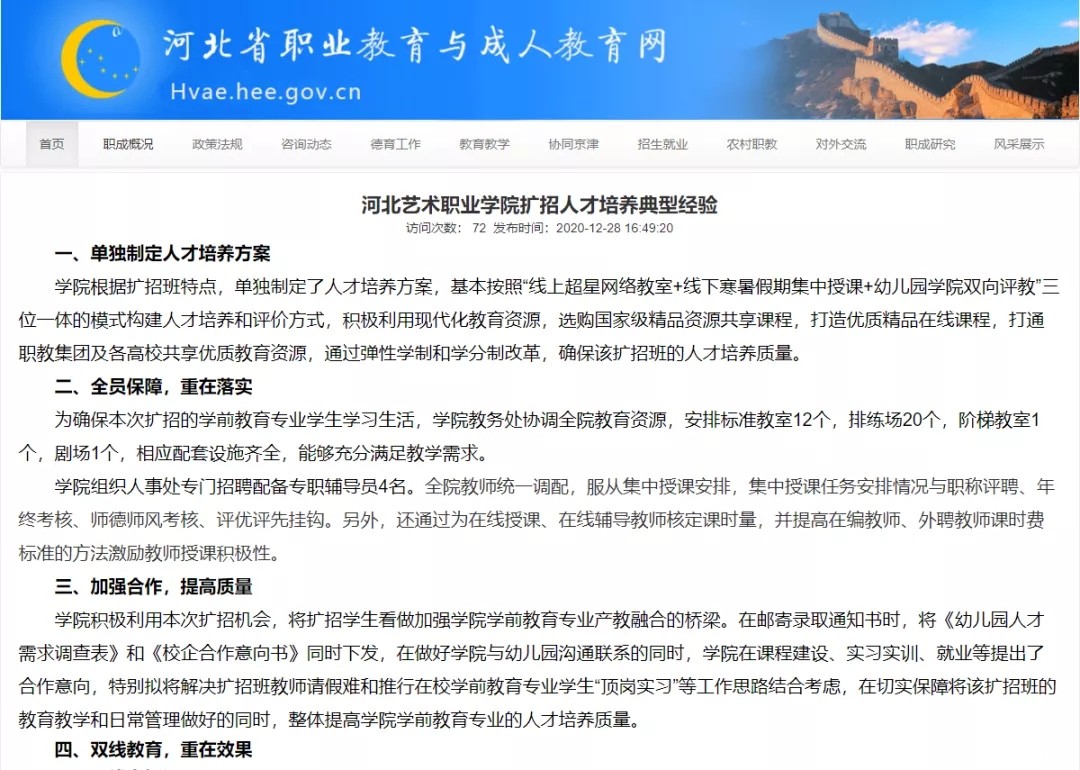 近日,我院在职扩招专项工作获得河北省教育厅肯定,相关做法被“河北省职业教育与成人教育网”作为典型经验进行宣传报道。据悉,此次报道的学校共有3所,我院列第一位。