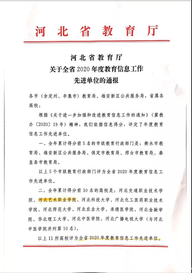 近日,河北省教育厅通报,我院获评全省2020年度教育信息工作先进单位,全年累积报送信息得分位列全省高校第二名,省直其他部门所属高校第一名。