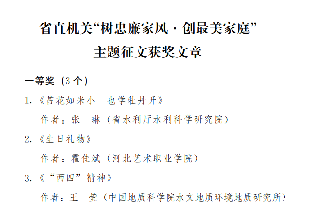 组织参加征文活动,讲好家风故事。学院纪委积极组织教师党员干部参加由省直纪检监察工委和省直妇工委联合举办的“树忠廉家风·创最美家庭”主题征文活动,学院后勤处、党政办、影视系、美术系等部门的多位教师积极投稿,在全部115个参赛作品中,传媒(影视)系教师霍佳斌荣获一等奖,美术系教师高峰等两名教师获得优秀奖。学院纪委将持续注重文化塑造,引导党员干部讲好家风故事、传承勤廉美德、培养廉洁家风。