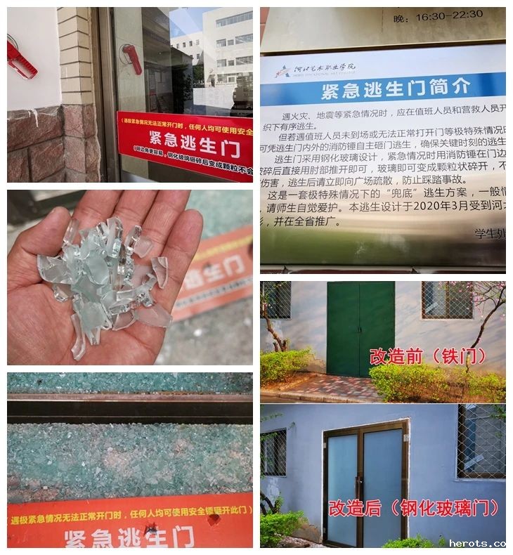 一是逃生实训。2020年,我院将所有宿舍安全出口的玻璃更换为钢化玻璃,并在门内外安装消防锤,如遇紧急情况时,学生可自主砸门逃生,门外师生也可自主砸门协助逃生。钢化玻璃破碎后成为对人身无危险的颗粒,是紧急安全门设计时的关键。