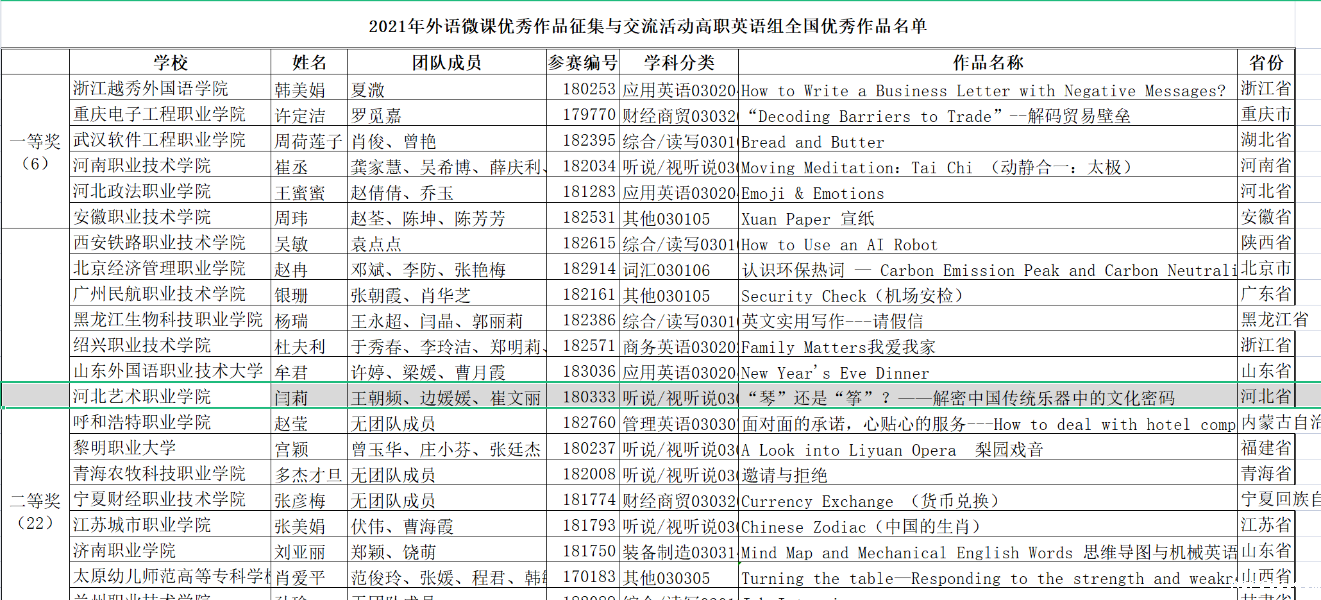 日前,由我院教师闫莉、王朝频、边媛媛、崔文丽组成的团队教学作品《琴or筝?——解密中国传统乐器中的文化密码(Deciphering The Cultural Code of Traditional Chinese Musical Instruments)》参加了2021年全国高校外语微课优秀作品交流活动,并喜获高职英语组全国优秀作品二等奖。