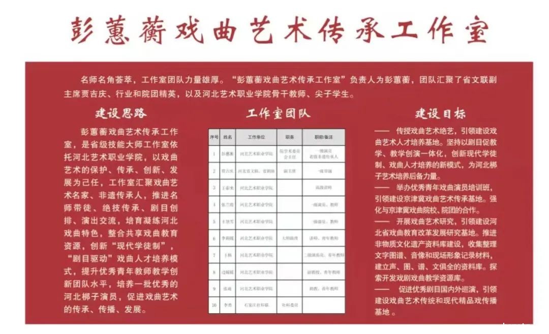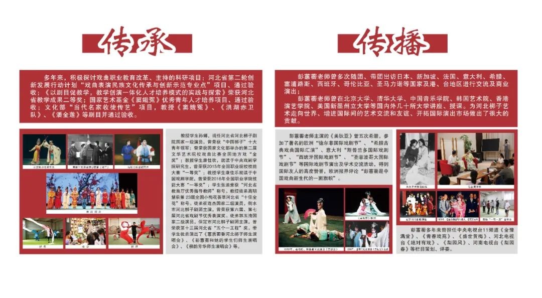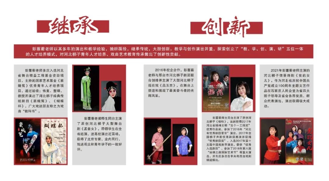 彭蕙蘅老师自2002年调入18luck快乐彩任教以来,充分发扬“爱生如子、爱校如家、爱艺如命”的18luck新利官网登陆精神,积极探讨戏曲职业教育改革,培养了一大批河北梆子青年人才,主持了国家艺术基金《窦娥冤》优秀青年人才培养等项目通过验收,排演了河北梆子实验戏剧《牺牲》等精品剧目,曾荣获第十三届河北省“五个一工程”奖。她主演的河北梆子情景诗剧《党的女儿》在2021年建党100周年之际,于“七一”前夕向河北省四大班子和省会各界代表演出,时任省委书记的王东峰同志评价该剧“选材好”“编的好”“演得好”“情景好”。彭蕙蘅戏曲艺术传承工作室的建立,将持续传授戏曲艺术绝艺、举办优秀青年戏曲演员培训班、开展戏曲艺术研究、促进优秀剧目国内外巡演,向引领建设戏曲艺术人才培养基地、京津冀戏曲艺术传承基地、河北省戏曲教育改革发展研究基地、戏曲艺术传统和现代精品戏传播基地的目标不断努力。
