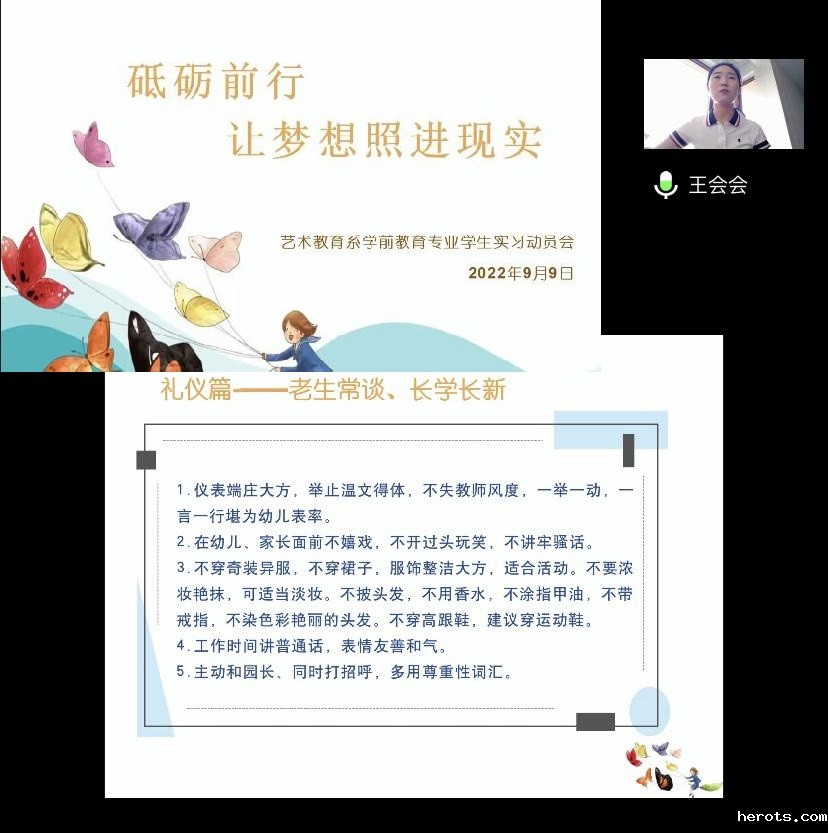 9月9日,18luck快乐彩艺术教育系学前教育专业召开长安区幼儿园实习线上动员大会。艺术教育系负责人王玮、副书记赵尤楠,技能教研室主任、理论教研室主相关教师与2020级学前教育专业全体实习生参加大会。
