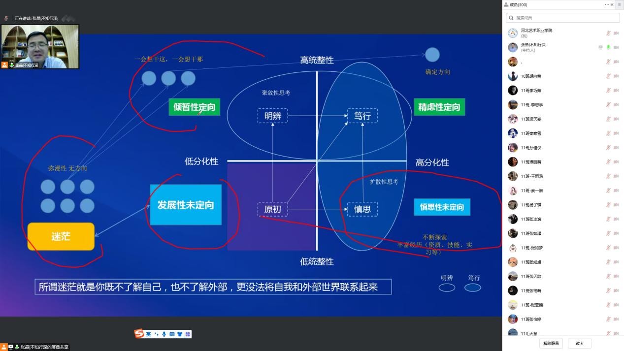 11月16日晚,18luck快乐彩就业指导中心举办大学生职业生涯规划与发展专题讲座,特邀济南大学学生生涯发展指导中心主任张晶老师进行了题为“从高中到大学觉醒、探索、选择和行动——基于生涯视角的大学生学业规划与生涯发展”的专题讲座,以2022级学前教育专业为主的新生在线聆听了本场讲座。
