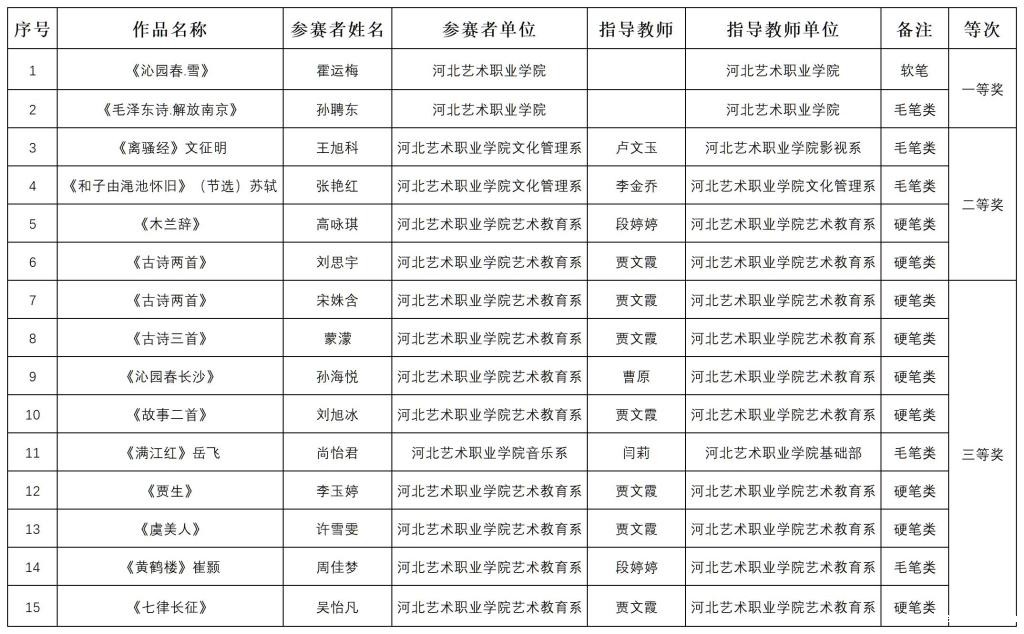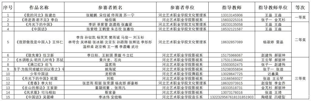 6月13日下午,第五届“诵读中国”经典诵读大赛、第五届“笔墨中国”汉字书写大赛河北选拔赛——18luck快乐彩校内评选活动圆满完成。此次活动由学院的7位老师组成评委团,分别是:文化管理系、王晶,基础教学部、霍运梅,艺术教育系、师盼瑶,舞蹈系、谭贻熙,美术系、魏庆峰,学生工作部、吕晓雷,影视系、卢文玉。经评委团评审,两个大赛分别评选出一等奖2名、二等奖4名、三等奖9名: