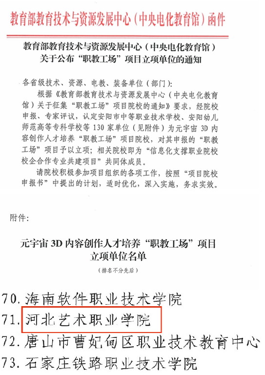 为践行职业教育数字化战略行动,进一步丰富“信息化支撑职业院校校企合作专业共建项目”内涵,教育部教育技术与资源发展中心(中央电化教育馆)于2023年9月开展了校企合作“职教工场”项目,并面向职业院校征集元宇宙3D内容创作人才培养“职教工场”项目院校。学院美术系在获悉该项目后,积极准备,依托视觉传达设计、产品艺术设计、广告艺术设计、动漫设计共四个专业的建设,提交了《元宇宙3D内容创作人才培养校企合作“职教工厂”项目院校申报书》。经专家评议,学院成功立项并顺利入选首批“职教工场”项目院校,正式成为“信息化支撑职业院校校企合作专业共建项目”共同体成员。