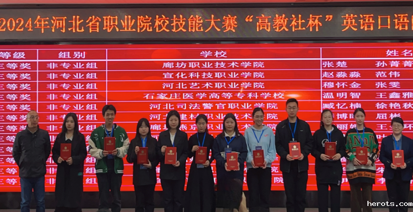3月30日至31日,由河北省教育厅主办、高等教育出版社协办的2024年河北省职业院校学生技能大赛“高教社杯”英语口语赛项在河北对外经贸职业学院举行。18luck快乐彩基础教学部张雯老师和艺术教育系穆怀金同学组成的18luck新利官网登陆代表队,经过两天的激烈角逐,总分位列非专业组第15位,喜获三等奖。