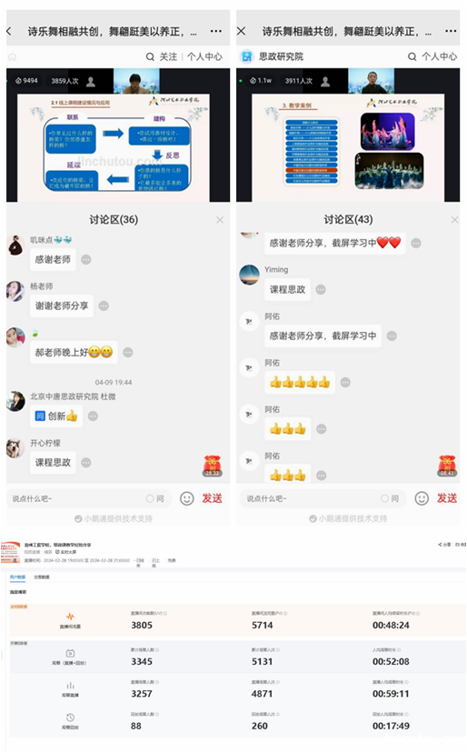 公益直播课程面向全国20 多个省、自治区和直辖市,3805名中职、高职院校教师观看了直播,人均观看时长59分11秒。直播课围绕少儿舞蹈编创“课程思政”体系建设、方法途径等内容深度开展讨论,以实战经验分享了18luck新利官网登陆“诗乐舞相融共创,舞翩跹美以养正”的建设经验,针对性强、内容丰富,让参训教师们印象深刻、深受启发。