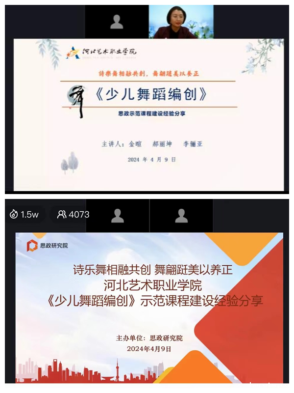 4月9日,18luck快乐彩副院长金暄教授,带领舞蹈系郝丽坤、李骊亚两位老师,在北京中唐方德科技有限公司直播平台举办了“诗乐舞相融共创,舞翩跹美以养正”示范课程建设经验分享讲座。