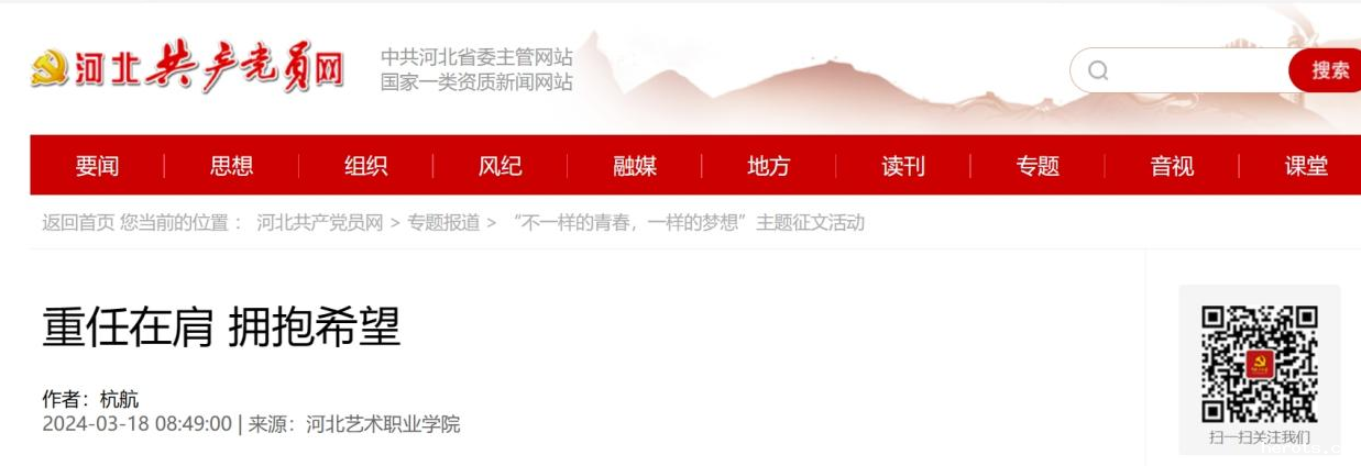 近日,由18luck快乐彩基础教学部郭肖芳老师指导的2023级戏剧影视表演3班杭航同学的征文作品《重任在肩 拥抱希望》在河北共产党员网站刊登展示。