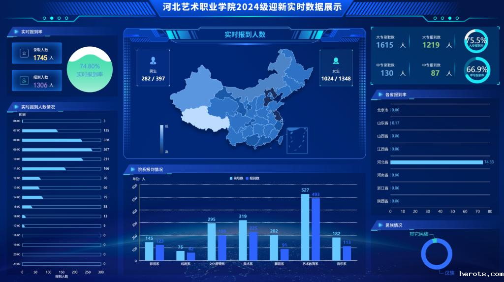 为确保每位新生顺利报到,图网中心的老师们现场办公,为新同学报到提供一站式服务,电子屏幕上实时显示2024级新生数据,各校区报到人数、生源地分布等信息一目了然。
